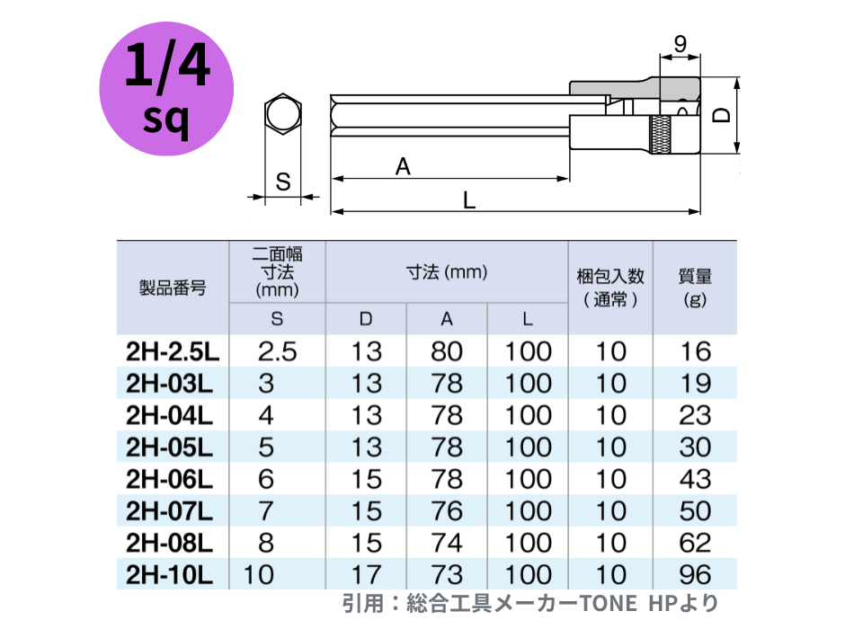 Amazon | トネ(TONE) ロングヘキサゴンソケット 2H-05L 差込角6.35mm(1/4") 二面幅5mm | ヘキサゴンビット