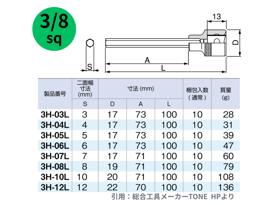 Amazon | トネ(TONE) 超ロングヘキサゴンソケットセット(ホルダー付) HH308LL 差込角9.5mm(3/8") 内容8点 | ソケットビット